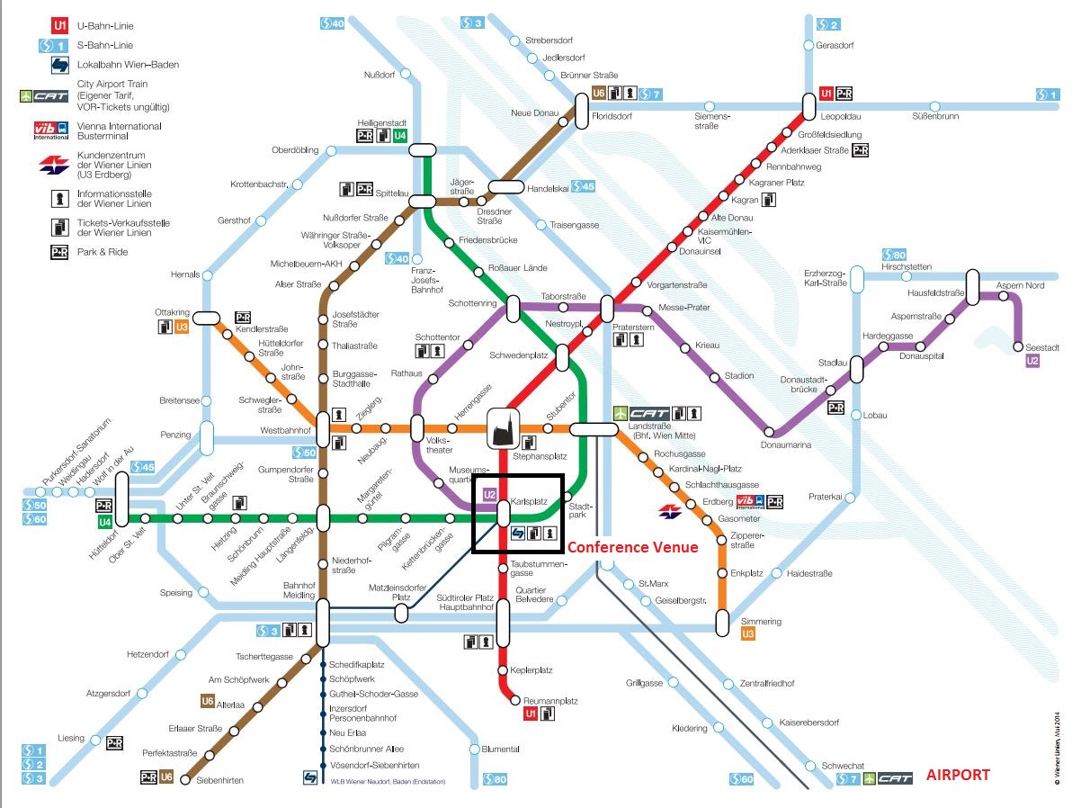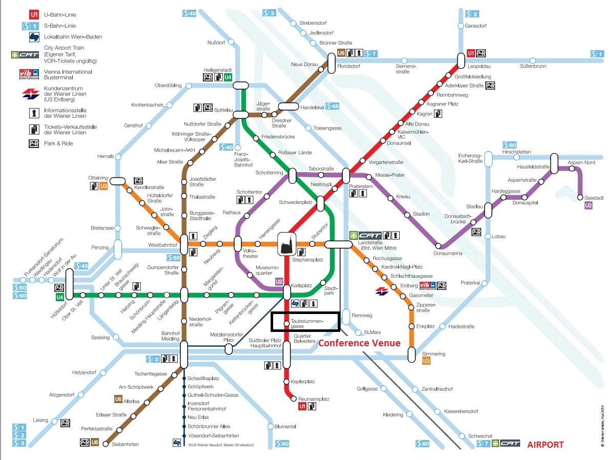 - The conference venue is located along underground line U1 (red line), stop “Taubstummengasse”. Take the exit “Floragasse”. The venue is on the left side.
